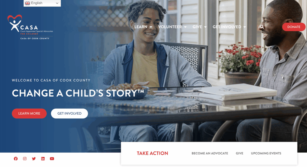 We placed the messaging of the Cook County branch’s main campaign, Change a Child’s Story, front and center. To do this, we heavily utilized photo and video assets to showcase advocates working with children and effecting positive change. Working within the national organization’s brand specifications, we used existing logos and colors to create a clean, engaging look. The client also wanted it to be impossible to ignore its events, so we placed an event tab directly under the hero section on the homepage to drive engagement and encourage site visitors to get involved.